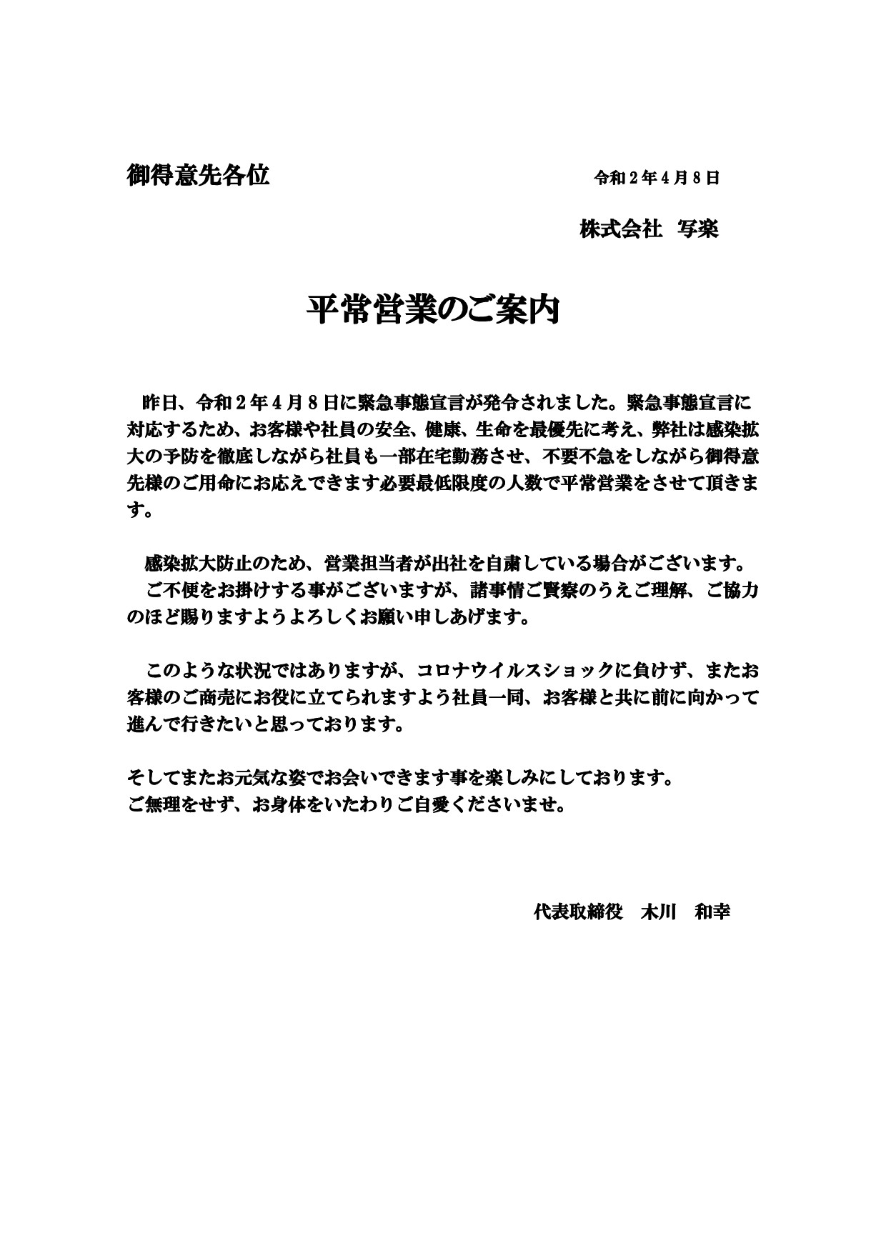 平常営業のご案内